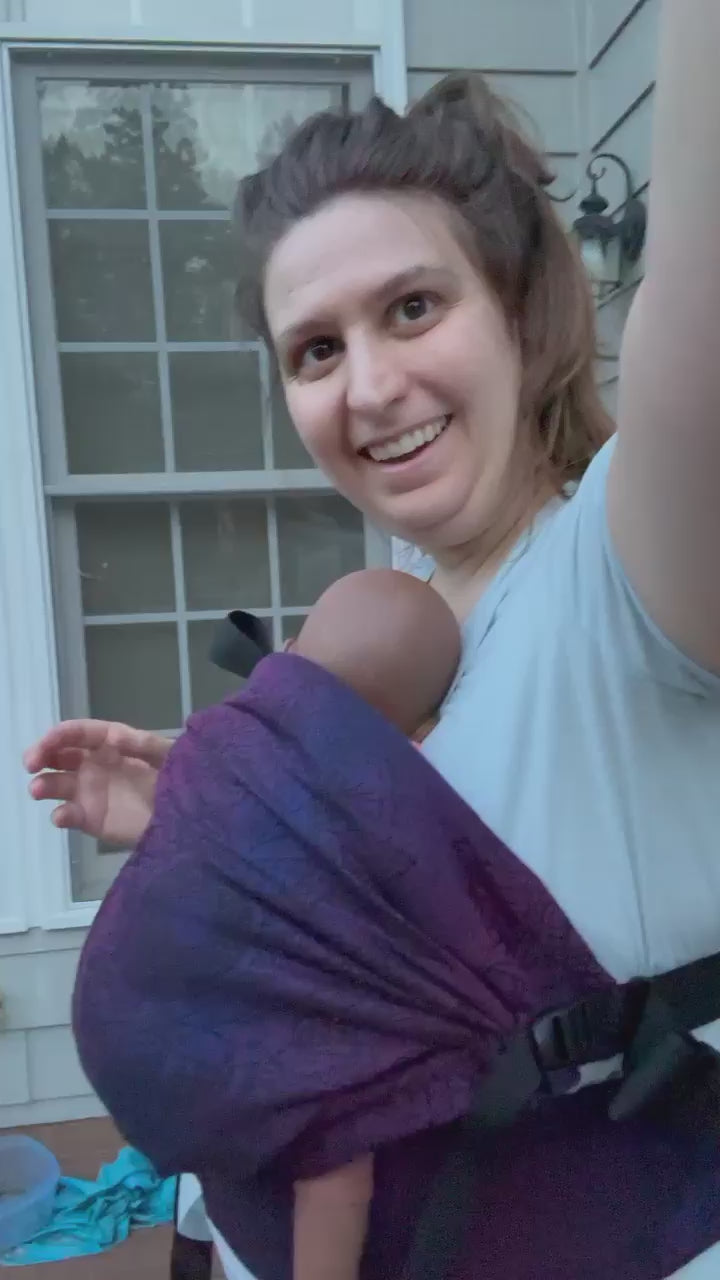 A mother wears her child in a baby backpack carrier in design Airglow with matching Airglow suck pads. Join Mama & Roo's babywearing educator and customer service rep Jessi...