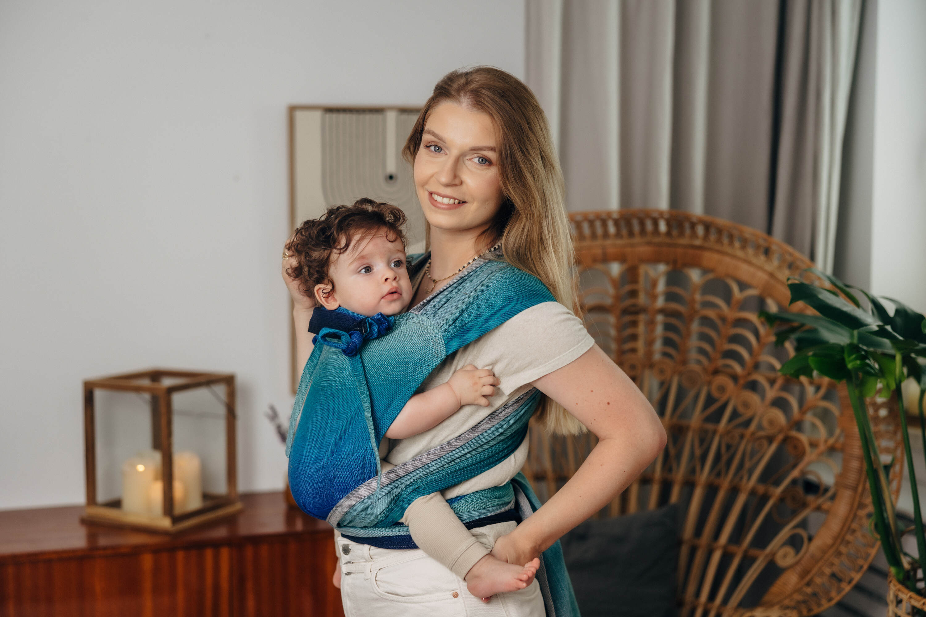 Our Wrap Strap Meh Dais can be used earlier than other carriers. Because the shoulder straps are made of a wide wrap fabric, the position of the baby is stabilized on the sides, similar to a full wrap.