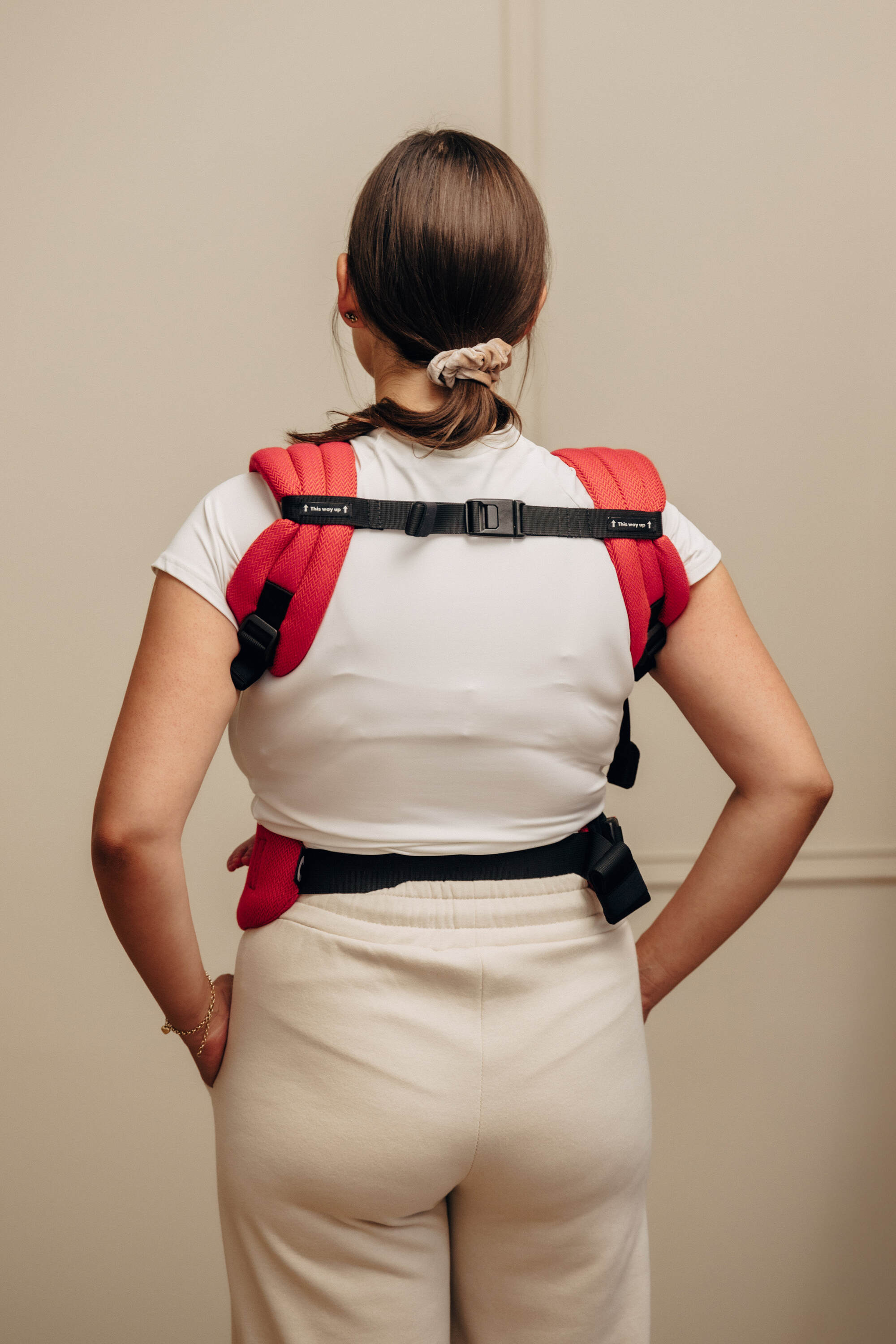 Method A - Put your arms through the ruck straps. Reach behind you to fasten the chest clip. The magnetic clip should fasten easily! Experiment with how loose you leave the straps, including the chest clip, before putting your child in the carrier, to see what's most comfortable for you. When buckled, use the webbing to tighten as is comfortable.