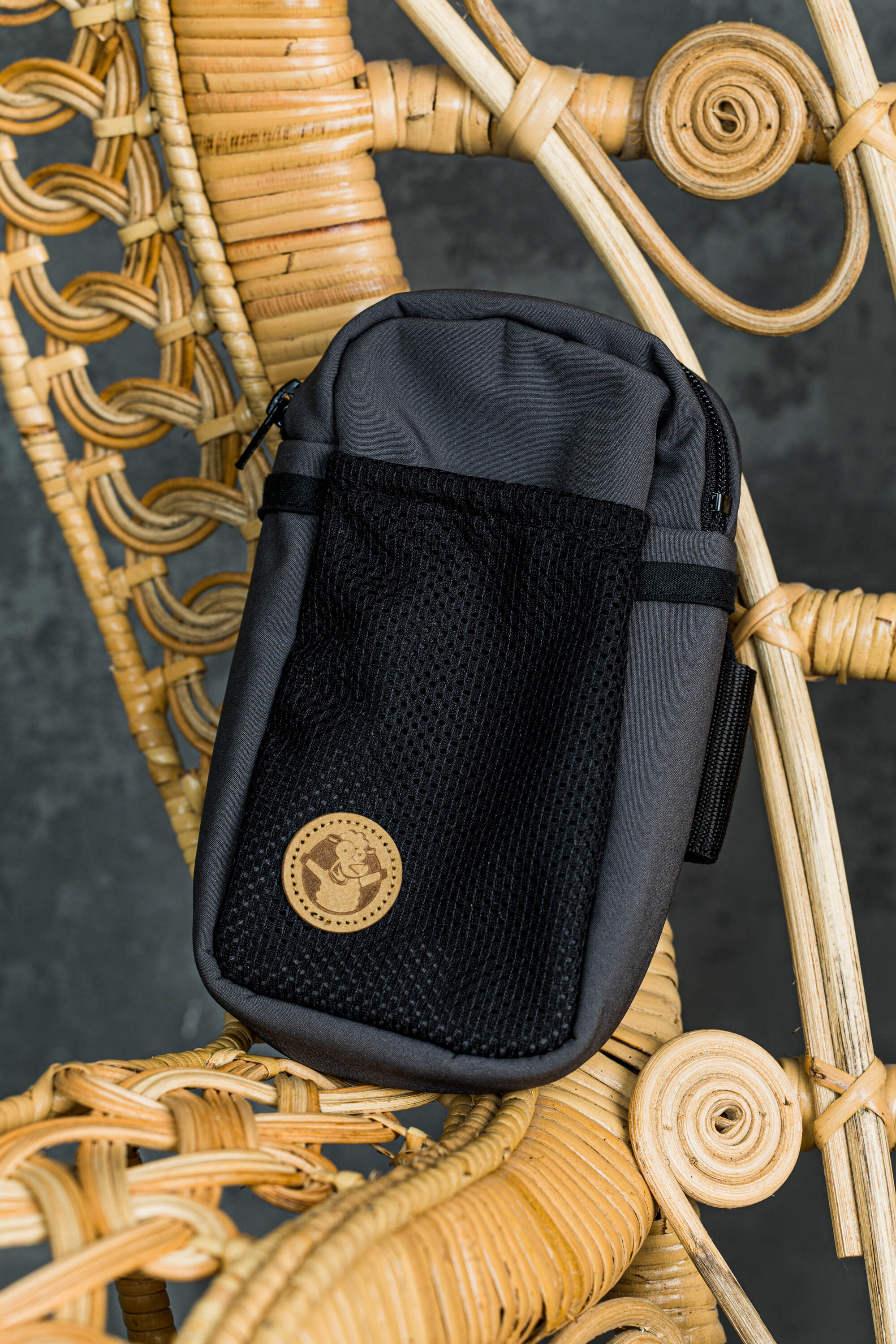 A portable baby carrier pocket. Includes zipper pouch and mesh outside pocket.