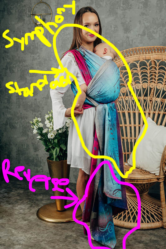 The shawl is made of 2 meters of wrap fabric. It is the same width as a wrap, and the ends are cut square.