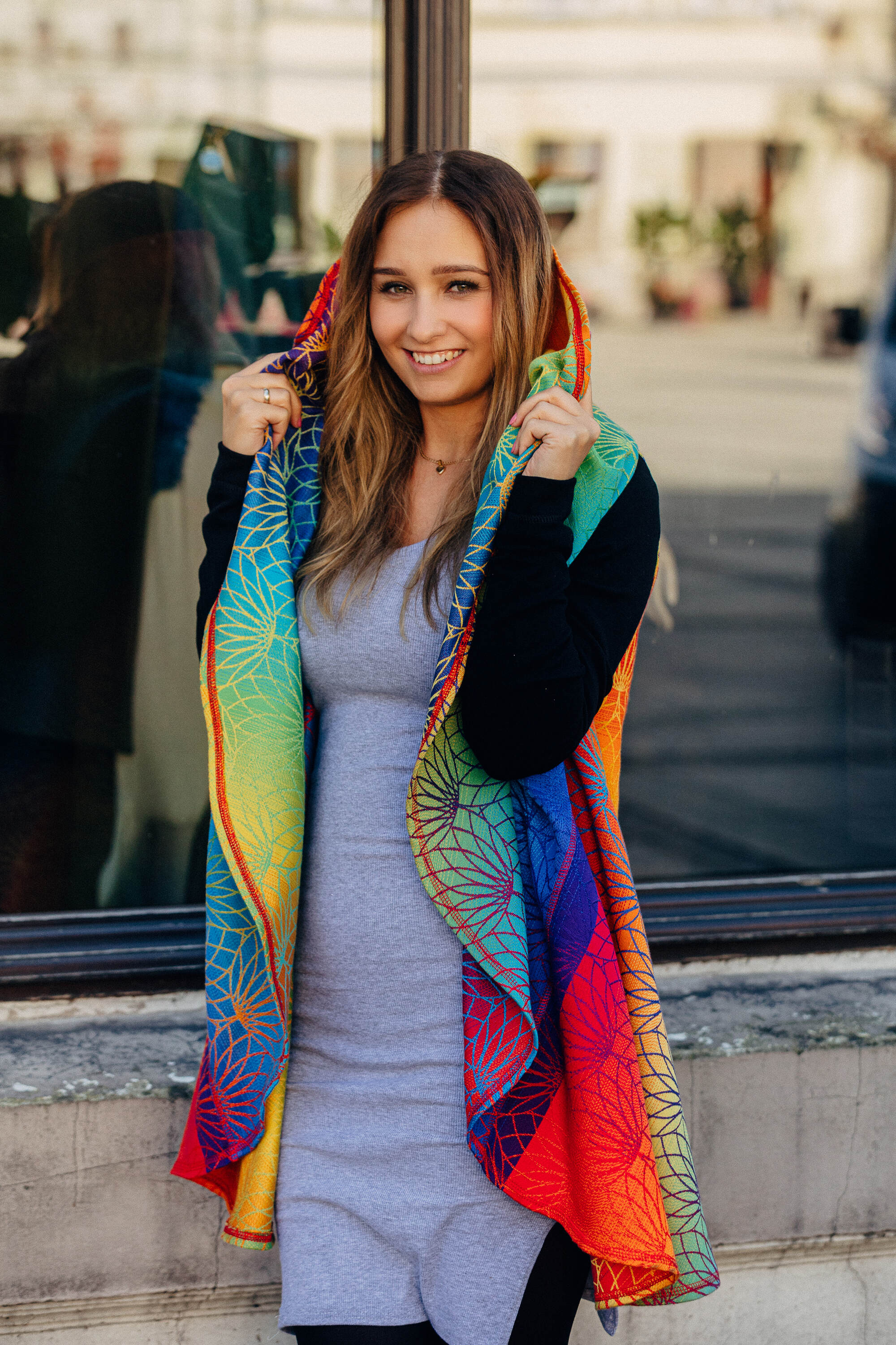 ATTENTION: The cardigan is not a “wearing” product. We put the cardigan on ourselves and the baby, which is in the wrap/carrier.